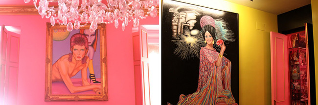 Nos fascinan las puertas a juego con el tono de cada habitación, los huecos que se originan en las paredes, que sirven como estanterías o los detalles dorados que invaden todos los espacios. Desde el cabecero de la cama hasta las patas de sillones con aire clásico recuperado. Toda una explosión de color junto con una decoración interior llena de temperamento. Sorprendente a su vez es la coordinación de detalles typical spanish, rincones revestidos en moqueta de leopardo junto con baños y aseos celestes o corales y empapelados con motivos a lo Elvis Presley. Con seguridad una de las casas más originilales de estilo ecléctico dentro de la península.