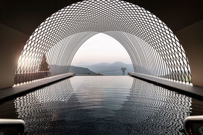 Porque incluso en la fachada más tradicional del hotel destacan los volúmenes que sobresalen sobre la fechada que anuncian el diseño contemporáneo del edificio. En la otra fachada que da a un jardín privado, el motivo del arco se ha llevado al extremo. En ella las grandes ventanas tienen forma de arco creando un original efecto y sobre las que destacan el elemento más espectacular del hotel.