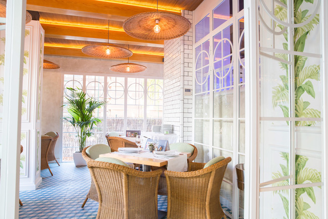 En la terraza, el ambiente es más relajado y parece la galería de una casa de campo inglesa con sus plantas y el uso del mimbre, como si estuvieras en un pequeño oasis en mitad del asfalto.