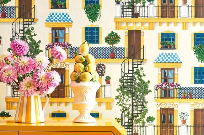La colección Seville de la firma Cole & Son nos ha parecido fascinante desde que la conocimos. Sus diseños se inspiran en la capital andaluza, en su arquitectura, en sus patios, en sus llamativos colores, en sus patios, y tiene como resultado papeles tan espectaculares como este.