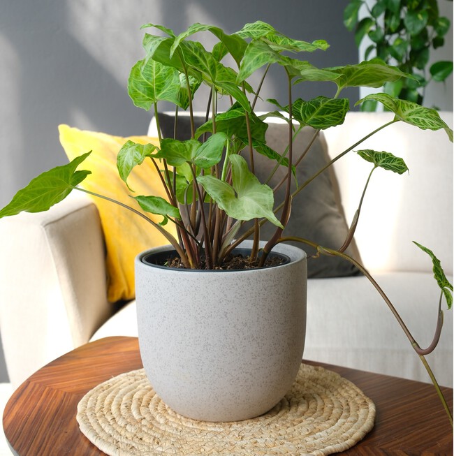 Y además, deberás cuidar que tenga un buen drenaje, ya que al singonio no le gustan los encharcamientos. De hecho, si te pasas con el riego y encharcas el sustrato, las raíces de tu planta se pudrirán.