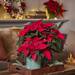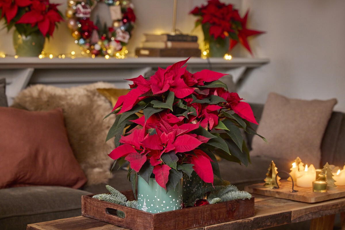 Su tamaño la hace especialmente adecuada para colocarla en el suelo en el salón o en el recibidor al lado del mueble de entrada, o junto a una escalera. Y si haces una composición con esta planta en el centro, y varias poinsettias de siempre dispuestas alrededor, el resultado será espectacular con la copa alta rodeada de pequeñas plantas. Incluso puedes dejar un hueco para colocar el nacimiento entre las flores de Pascua más bajas.