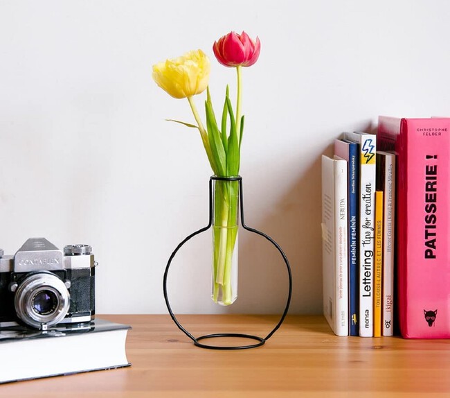 Este florero nos ha gustado por su diseño sencillo y minimalista, compuesto por una probeta y un soporte de metal con la forma de la silueta de un jarrón. Cuesta 16,75 euros en Amazon.