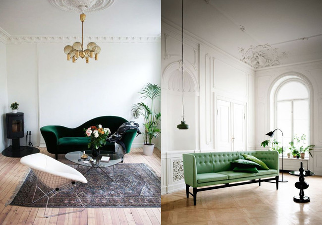 Según el estilo de nuestra decoración interior y el efecto que queramos alcanzar podremos escoger un sofá de un verde intenso que tendrá mucha personalidad. En esta caso esta será la pieza maestra del salón, el rey de la decoración alrededor del cual todo lo demás girará.
