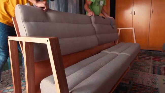 En el vídeo podemos ver las diferentes funciones que puede cumplir este original mueble. Su posición natural es la de sofá con dos pufs, aunque se puede convertir rápidamente en chaise-longue o en cama con solo reorganizar estas piezas.