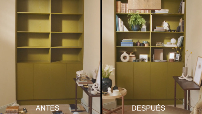 Lo normal es que la librería contenga ibros. Para empezar puedes organizarlos por tamaños y grupos en distinta baldas. Aqui recuerda el truco de los estilistas y si no te gusta el resultado o los colores excesivos de los lomos, prueba a darles la vuelta. El canto de las cantos tiene un color homogéneo.