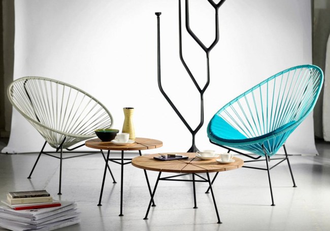 Nos sorprende la silla balancín con diseño nórdico y parecido a una trineo o bota de montaña tan divertido, así como la silla basculante con un asiento realizado en gomas elásticas, que desprende sensación de relax.