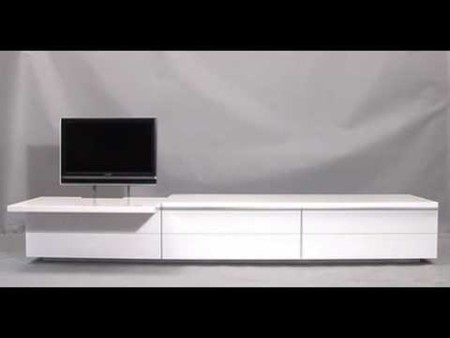 El mecanismo es muy sencillo, se desliza la parte superior del mueble y el televisor sube del lugar en el que está habitualmente guardado, después la tapa del mueble vuelve a ubicarse en su sitio, cuando queremos guardarlo el televisor baja de la misma manera, por lo demás el mueble es el típico bajo de salón tan de moda en los últimos tiempos.