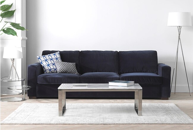 Otro sofá que está al 50% de descuento. Este sofá de 3 plazas es amplio, y tiene una encantadora apariencia retro gracias a su atractivo color azul noche. Tiene estructura de madera, y un tapizado suave agradable al tacto. Antes costaba 1.995 euros, y ahora cuesta 989 euros.