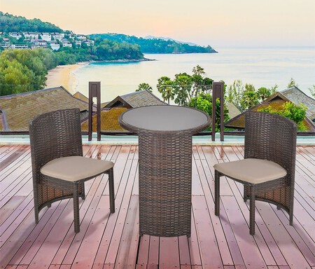 Este conjunto de muebles de ratán sintético es de la marca Outsunny, y está compuesto por tres piezas: una mesa de café redonda con encimera de cristal y un estante bajo el tablero, y dos sillas a juego con cojines.
