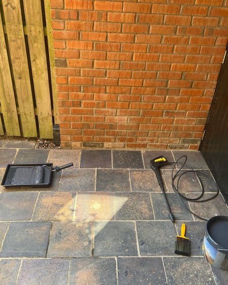 Antes era un rincón frío, poco funcional que simplemente daba acceso a la vivienda. Pero sus propietarios vieron potencial donde antes solo se veía cemento. Así, apostaron por renovar el pavimento con pintura blanca de exterior y plantillas para simular un suelo de baldosa hidráulica y lo combinaron con pintura oscura en la valla. El resultado tiene mucha personalidad como se puede ver en las fotos.