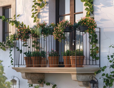 En la barandilla también puedes instalar una jardinera colgante, o incluso cultivar una planta trepadora para que enmarque la puerta que comunica el interior de tu casa con la terraza.