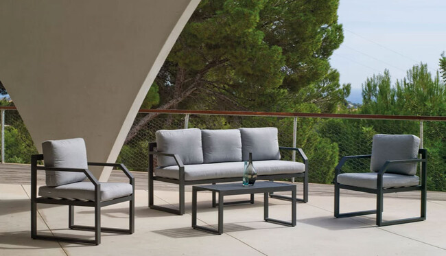 Este otro conjunto de jardín fabricado en aluminio, de color negro tiene ahora un 43,46% de descuento, Se compone de un sofá de tres plazas, dos sillones individuales y una mesa de centro. Su precio normal es de 1.300,00€ y ahora es de 735,00€