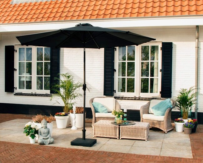 Nuestra primera propuesta es esta sombrilla Recanati basculante en color negro. La sombrilla es inclinable, por lo que siempre puede sentarse a la sombra sin tener que mover la sombrilla y es realmente fácil ajustar la sombrilla a la posición del sol. Cuesta 89,95 euros.