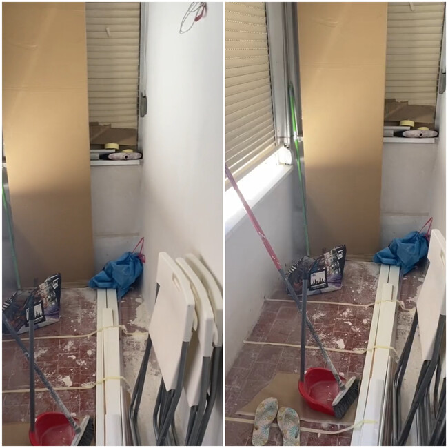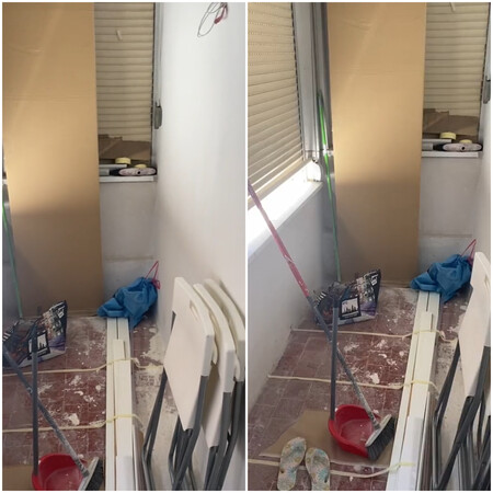 Después de una buena limpieza de toda la cal y pintura caída por el suelo, la mejor idea era instalar un suelo RUNNEN de Ikea, con baldosas imitación madera encajadas justo encima de las baldosas iniciales, sin levantar el piso.