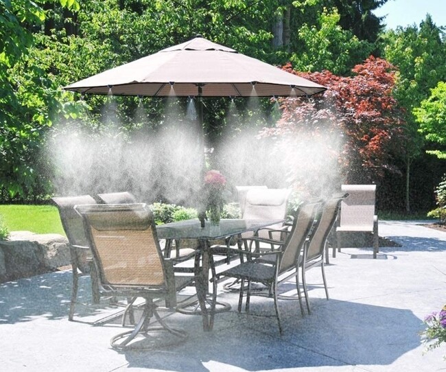 Los nebulizadores son otro sistema que nos ayudarán a refrescar el ambiente mientras tomamos una copa o estamos cenando. Podemos instalarlo en una sombrilla, en el techo de la terraza o del porche, sobre las tumbonas en las que tomamos el sol... y sueltan unas gotitas diminutas ideal para refrescarnos creando una suave cortina de agua.