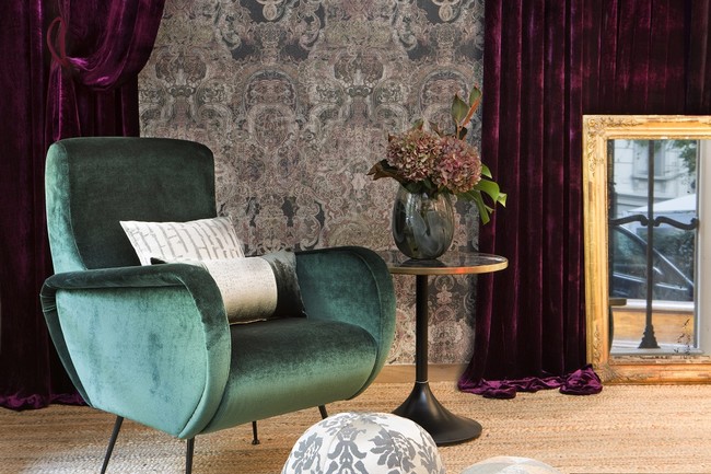 Un terciopelo que tiene una caída elegante y con prestancia que se puede utilizar para confeccionar unas cortinas, provechando un diseño refinado y armonioso con un dibujo de Paisley (una lágrima curvada) y que presenta hasta 11 tonalidades diferentes.