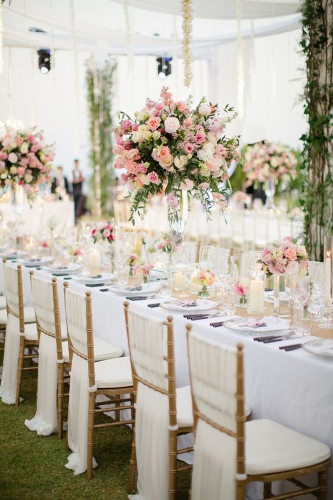 Plata, cristal y delicadas rosas blancas son las elegidas. Centros volantes y modernas combinaciones pueden dar el punto moderno a una boda clásica pero muy sofisticada.