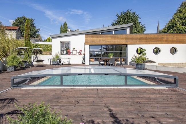 Alterando un poco el orden de la lista, empezamos con la segunda que a nosotros nos ha parecido adorable, una cubierta telescópica ultrabaja que aúna el confort y la estética flat design y que podéis ver en la foto sobre estas líneas. Su estilo es contemporáneo y depurado: sin tornillos aparentes, sin raíl de suelo y con una altura limitada. Es un diseño concebido para liberar al máximo el espacio perimetral de la piscina y ofrecer una discreción máxima.
