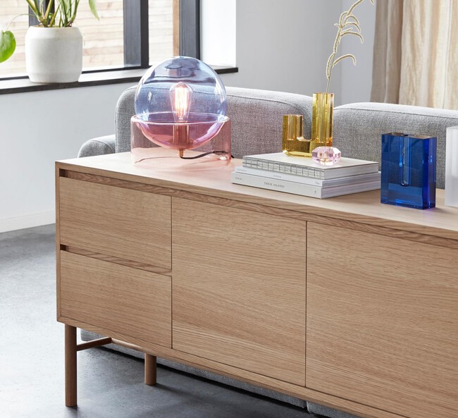 Con esta lámpara de mesa con look esférico, y hecha en vidrio tintado, también podrás dar el toque Very Peri a tu hogar. Precio: 154 euros.