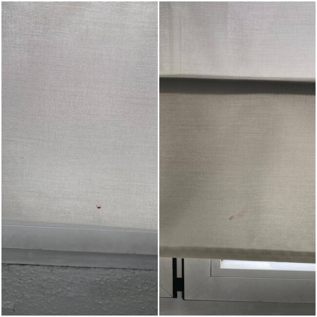 Como veis, el estor tenía algunas manchas de maquillaje dispersas por la parte de abajo. Por eso, he aplicado el líquido limpiacristales y, con la bayeta he ido restregando poco a poco. Es un proceso costoso, ya que tienes que empujar bien la bayeta para eliminar el producto, pero merece la pena.