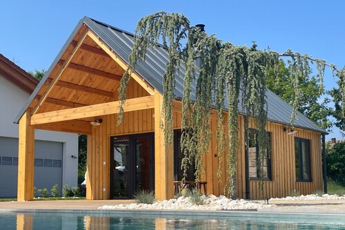 El diseño exterior de la cabaña también se cuida al detalle. La fachada de madera y los acabados modernos permiten integrar la vivienda en cualquier entorno, desde jardines urbanos hasta parcelas rurales. Por su tamaño compacto, se convierte en una opción versátil que puede adaptarse como vivienda principal, casa de invitados o espacio de trabajo creativo.
