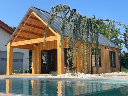 El diseño exterior de la cabaña también se cuida al detalle. La fachada de madera y los acabados modernos permiten integrar la vivienda en cualquier entorno, desde jardines urbanos hasta parcelas rurales. Por su tamaño compacto, se convierte en una opción versátil que puede adaptarse como vivienda principal, casa de invitados o espacio de trabajo creativo.