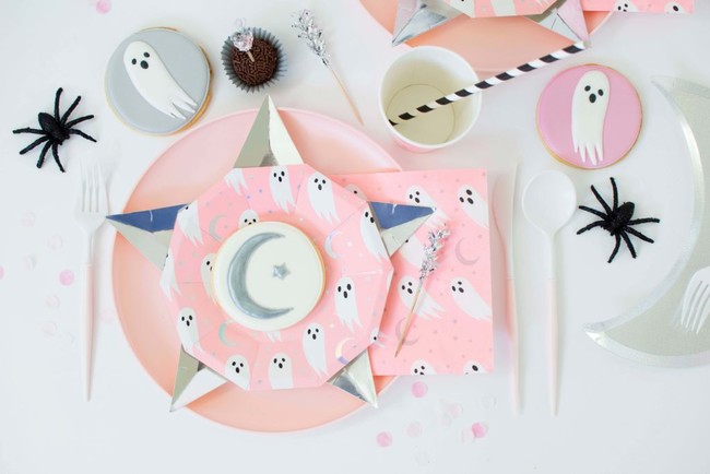 Las guirnaldas y composiciones orgánicas con globos que simulan formas orgánicas están de moda. Y en esta tendencia del Halloween rosa no podía faltar. Globos rosas, blancos, grises son ideales para crear estas composiciones. Y si además le añades detalles como unas arañas, o creas una cara fantasmagórica en alguno de los globos pintándolos o con pegatinas o cartulinas, la escena será redonda.