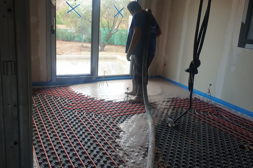- Vertido de anhidrita o mortero autonivelante. Esta capa recubre los tubos y servirá de base para el pavimento final.