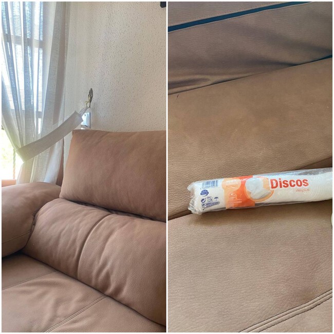 La suavidad de la polipiel y su calidad fue lo que me llevó a elegir este tejido como componente para mi sofá. Sin embargo, también tiene inconvenientes como la complejidad a la hora de limpiarlo. Por eso, cuando vi este experimento, confié en el proceso y, con mucha paciencia, empecé a frotar con un disco desmaquillante bañado en alcohol, toda la superficie manchada.
