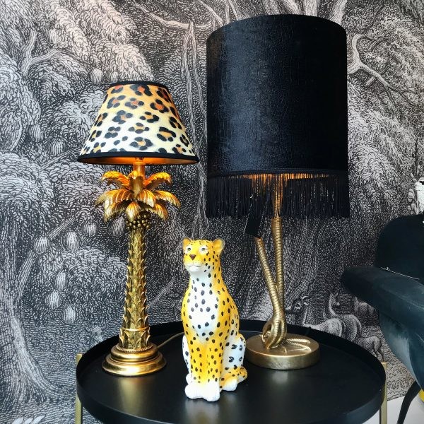 Love Frankie muestra sus tendencias con grandes toques de glamour para interiores oscuros y brillantes. La decadente lámpara de mesa Gold Palm Tree y la minipantalla de tela de cocodrilo Mock negra con forro metálico es el complemento perfecto para estancias pintorescas.