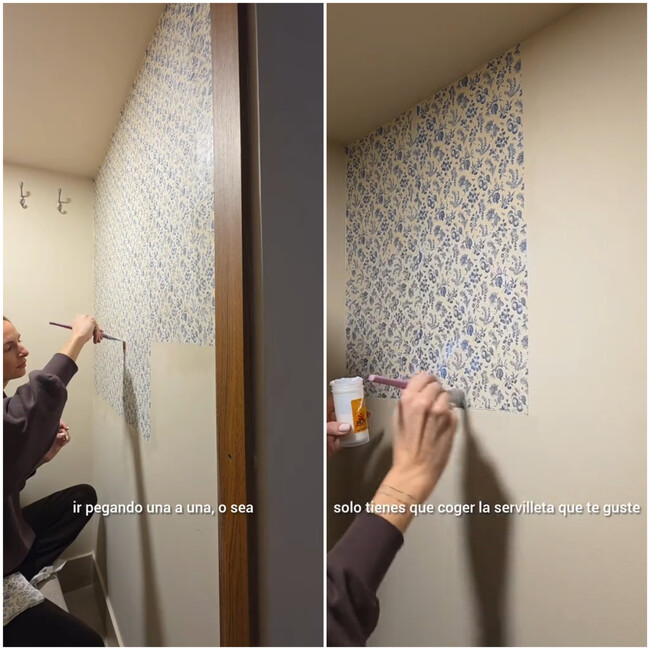 La propuesta es sencilla, económica y sorprendentemente efectiva. Según la experta en decoración de interiores, solo necesitas servilletas del diseño que más te guste y un poco de paciencia. La técnica consiste en separar las capas de la servilleta (quedándote con la más fina) y pegarla cuidadosamente a la pared.