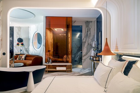 Las formas geométricas y curvas que rodean la zona de la cama crean un espacio mágico que invita a la relajación y a la observación de los detalles que pueblan el espacio, con elementos tan destacados como las lámparas o las mesillas. A fin de cuentas, ¿no es una buena inversión acostarse rodeado de un diseño bonito, y despertarse en un espacio inspirador?