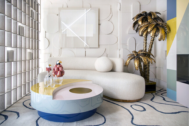 Este salón diseñado por As Interiorista (el estudio de diseño formado por Adriana Somoza y Caridad Tercero) para la edición de Casa Decor del 2021, combina los elementos más clásicos de inspiración midcentury, con elementos tan contemporáneos como una pared texturizada y diseñada con un relieve de geometrías sobrepuestas.