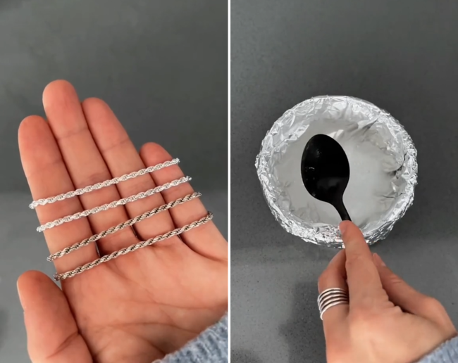 Realmente, este truco para devolver su esplendor a las joyas no puede ser más sencillo y eficaz. Para utilizarlo, hay que comenzar poniendo a hervir agua. Mientras el agua llega al punto de ebullición, puedes aprovechar el tiempo forrando un bol con papel de plata, teniendo cuidado de que "el lado mate quede hacia abajo".