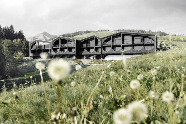 De interiores claros y luminosos, el hotel destaca por su original estructura inspirada en la arquitectura vernácula de la región y en el clásico granero de madera. De hecho, sus formas redondeadas son una reinterpretación contemporánea de este tipo de edificios.